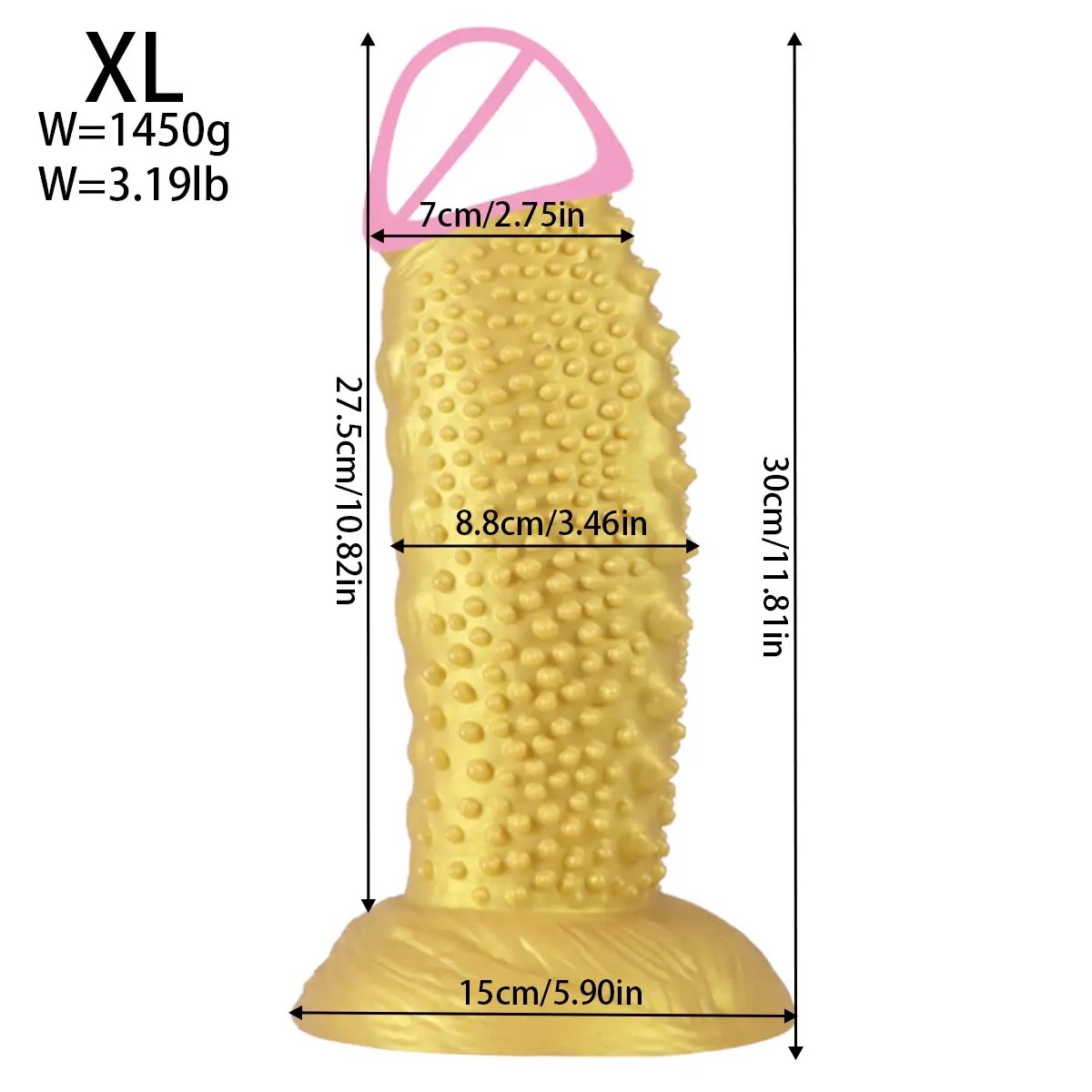 - XL: Insertable Length: 10.82 Inches (27.5cm), Diameter: 2.75 Inches (7cm), Max Diameter: 3.46 Inches (8.8cm), Usable Stem Length: 5.90 Inches (15cm), Weight: 3.19lb (1450g)