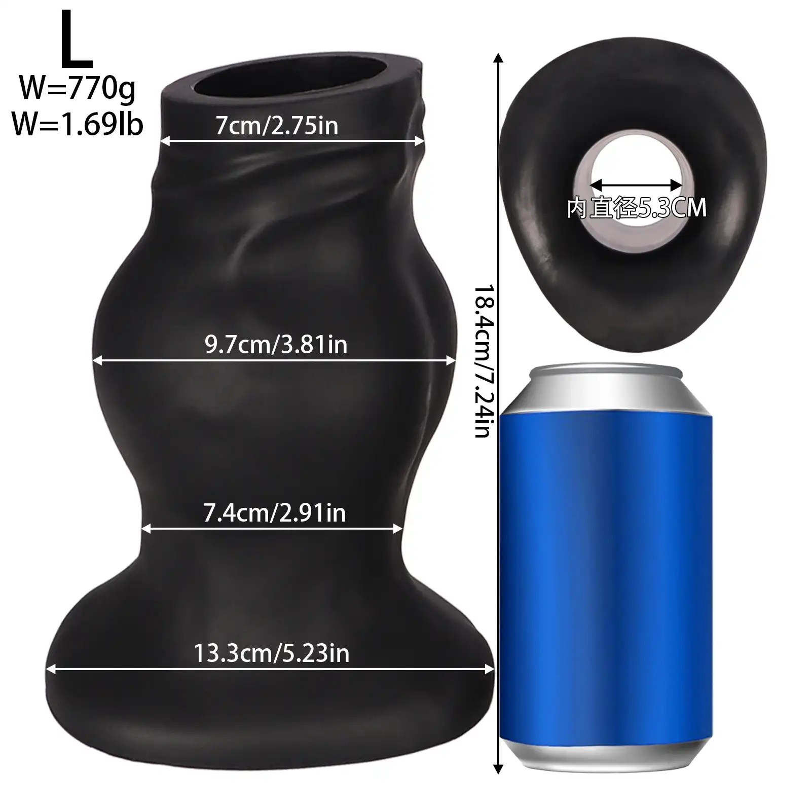 - Size (M): 7.24″ (18.4cm) Length, 2.75″ (7cm) Diameter, 3.81″ (9.7cm) Head Diameter, 5.23″ (13.3cm) Suction Cup Diameter, 2.08″ (5.3cm) Inner Diameter