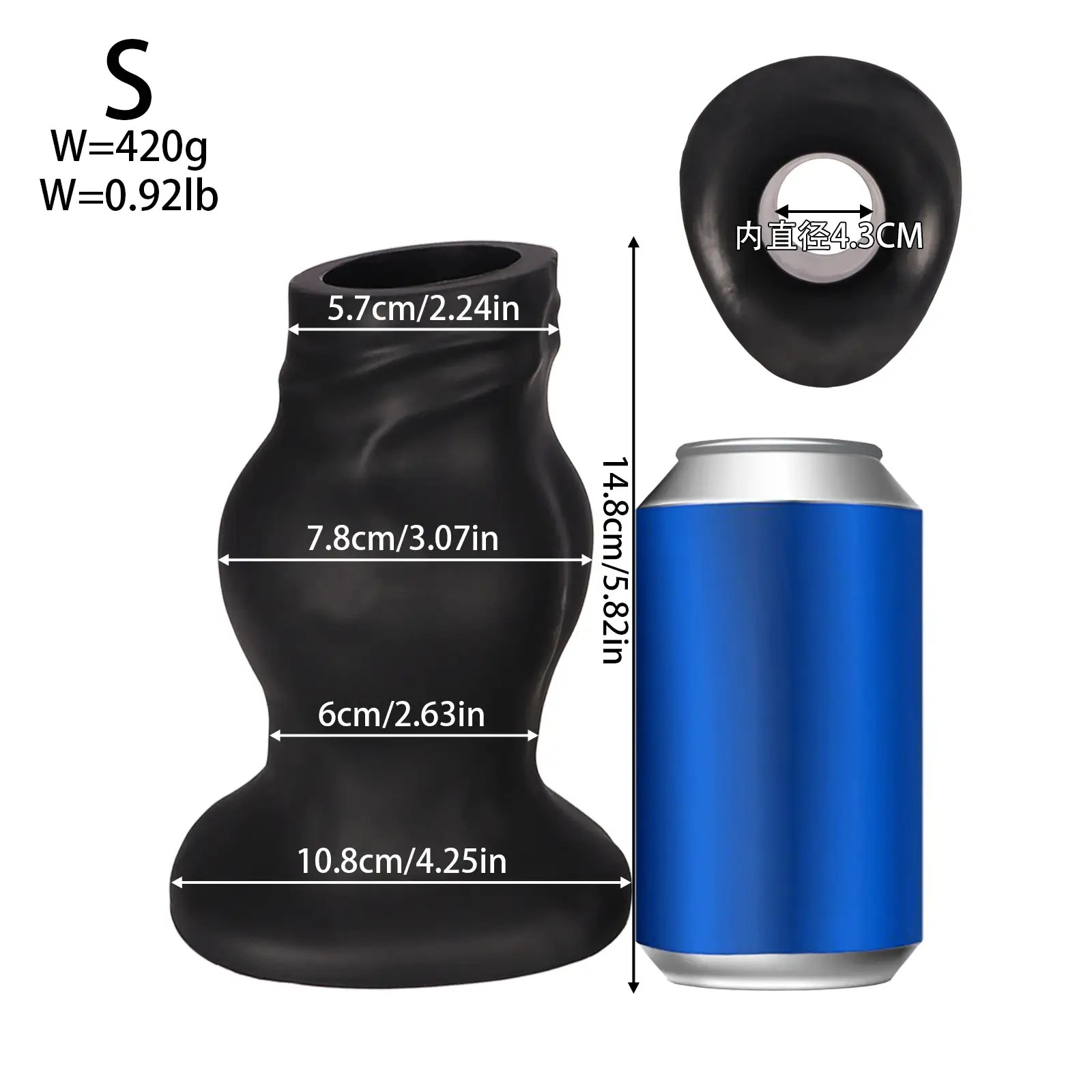 - Size (S): 5.82″ (14.8cm) Length, 2.24″ (5.7cm) Diameter, 3.07″ (7.8cm) Head Diameter, 4.25″ (10.8cm) Suction Cup Diameter, 2.36″ (6cm) Inner Diameter