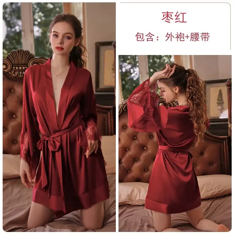 - 1 x Sexy Bathrobes – Lace Trim Satin Kimono Robe